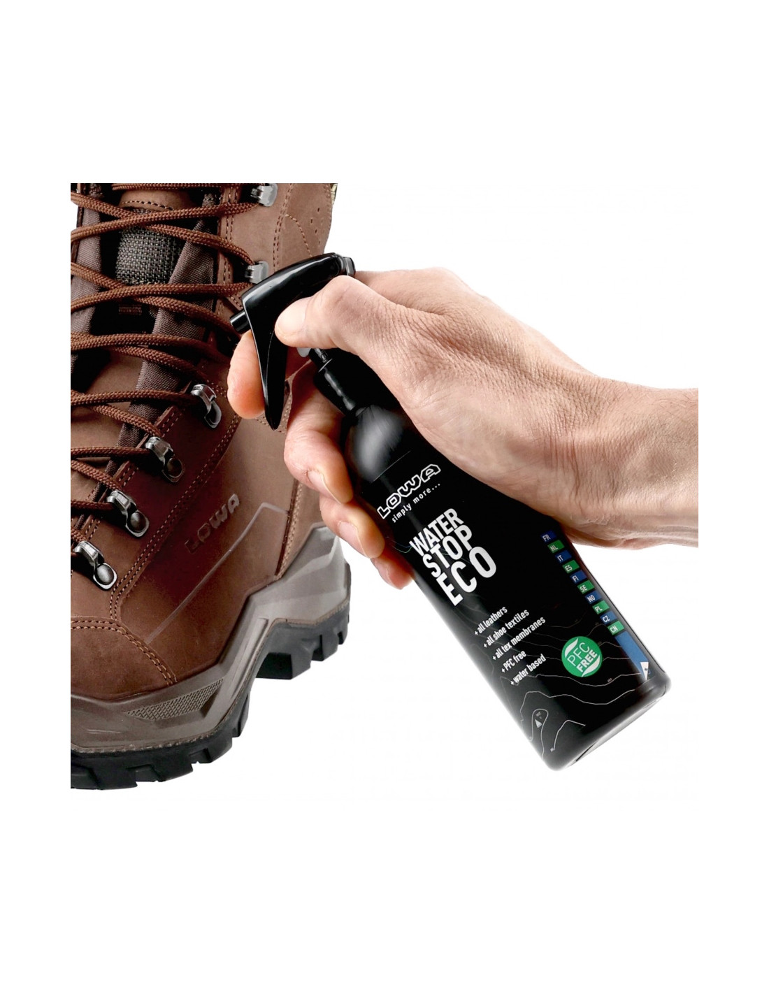 LOWA WATER STOP ECO 200ml est un spray d'imprégnation haute performance à base d'eau, spécialement conçu pour protéger toutes les chaussures tactique, de loisirs, de montagne et de randonnée. Il assure une barrière efficace contre l'eau et la saleté sans altérer la respirabilité des matériaux.