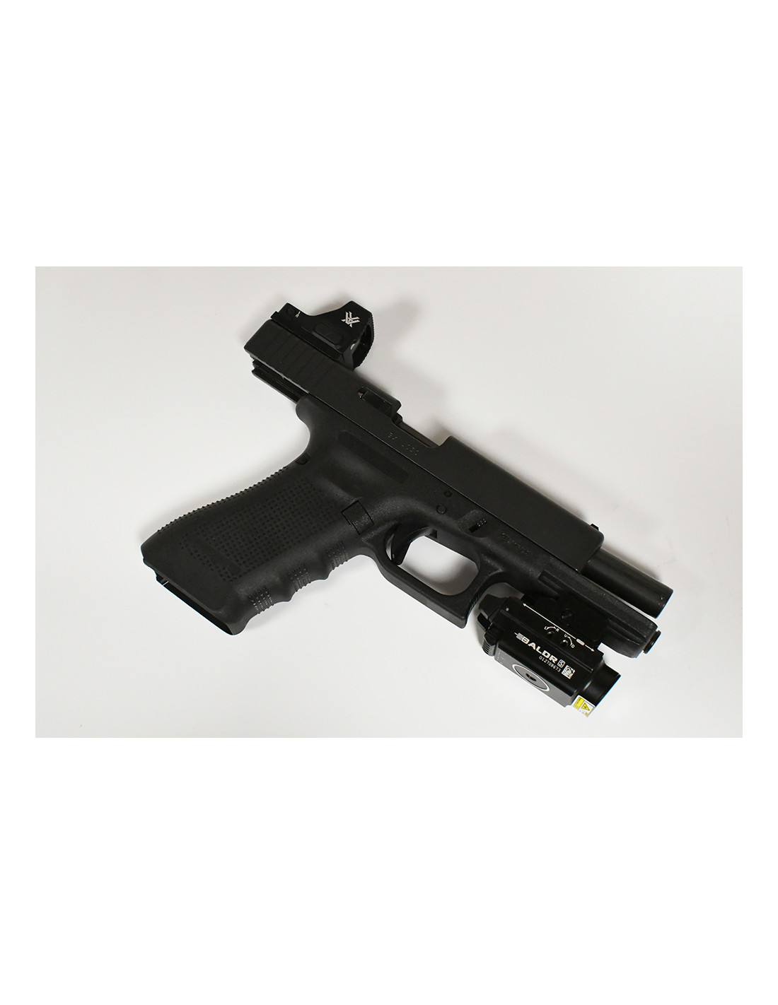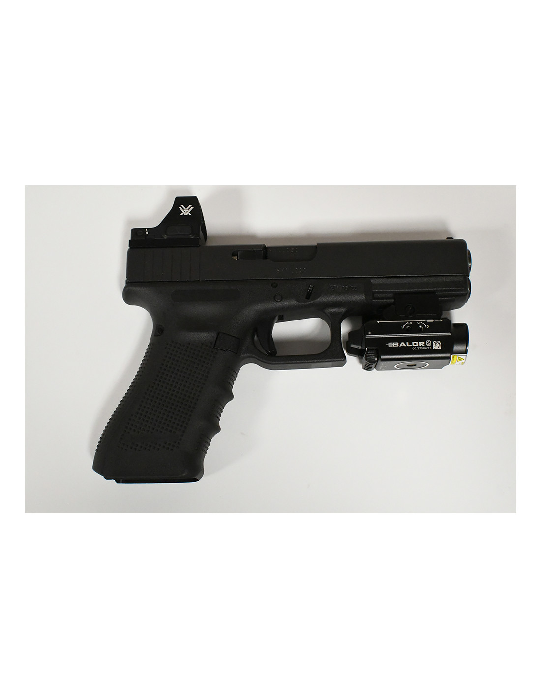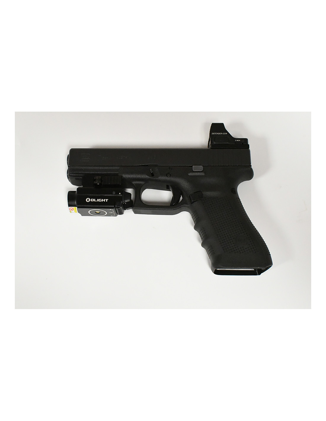 Ce modèle est équipé d’un point rouge Vortex Defender CCW 3 MOA, permettant une acquisition rapide et précise de la cible, ainsi que d’une lampe Olight montée sur le rail, améliorant la visibilité et l’utilisation en conditions de faible luminosité. La plateforme Glock Gen 4 se distingue par son ergonomie optimisée et son système de dos de poignée interchangeables, garantissant une excellente prise en main.