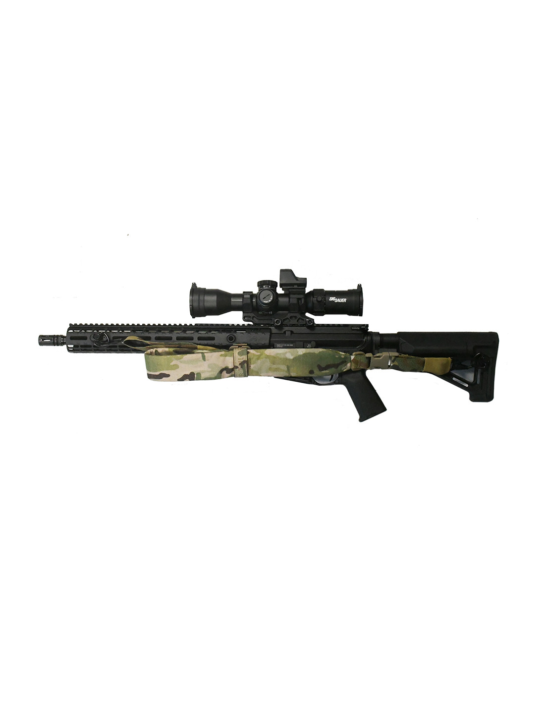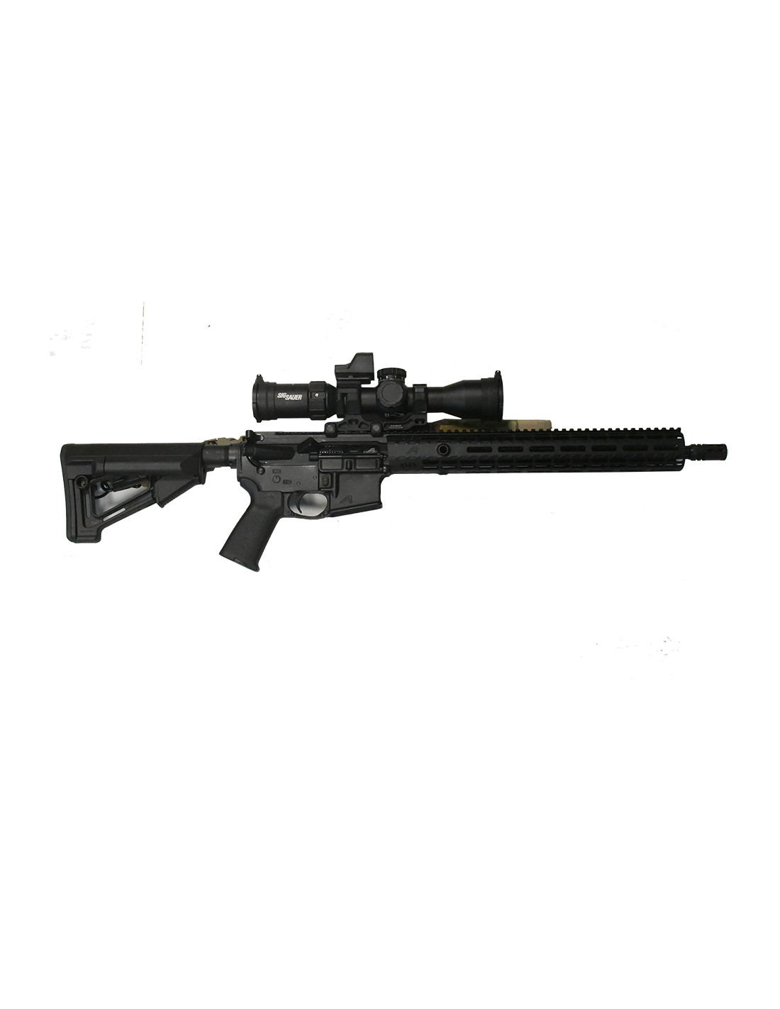 Équipée d’une lunette Sig Sauer Tango MSR 2-12x44 montée sur un montage monobloc Badger Ordnance, cette carabine permet un tir précis à courte comme à moyenne distance. Elle est complétée par un point rouge Swampfox Liberty offrant une solution rapide pour l’acquisition de cible. La crosse Magpul et la poignée UTG 45° squelette améliorent le confort et la prise en main.