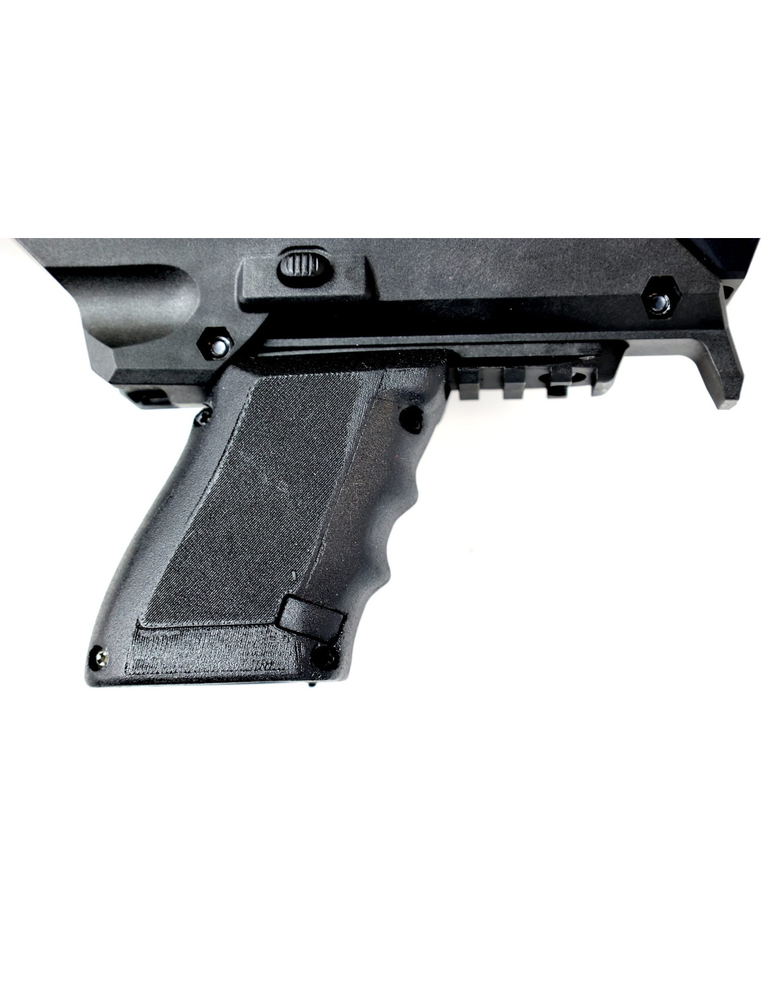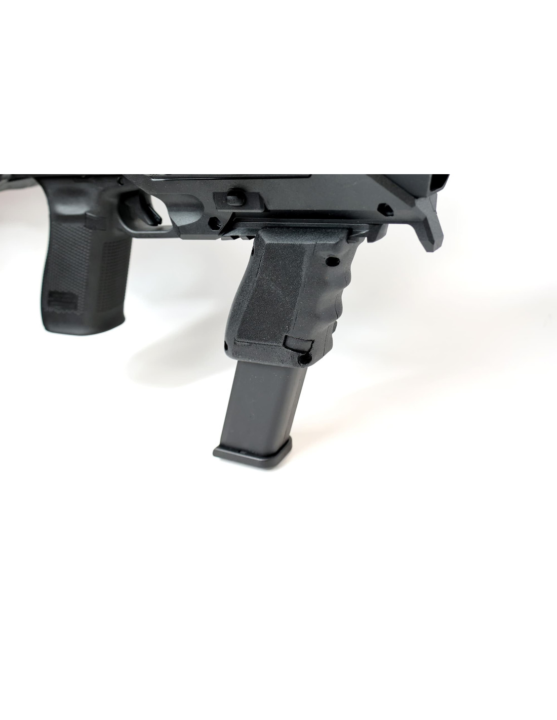 - Support chargeur intégré : Permet d’emporter un chargeur supplémentaire directement sur la poignée avant.