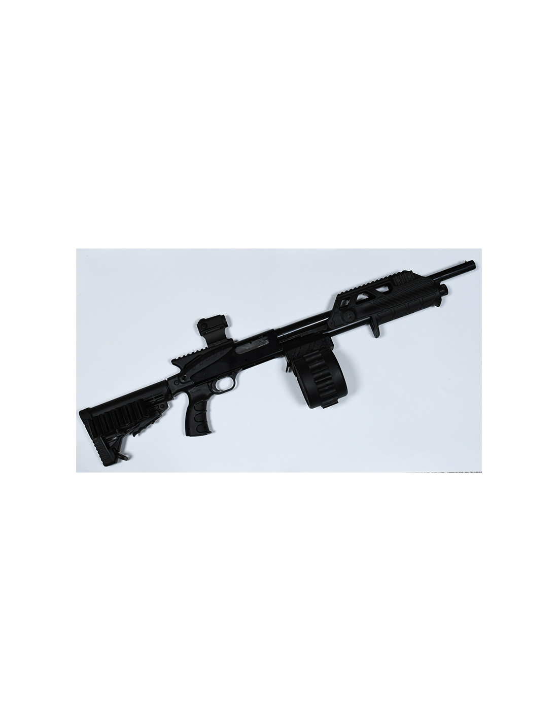 Le chargeur tambour fourni accepte les cartouches jusqu’au format 12/67,5, idéal pour les slugs standards et les séances de tir récréatif. Cette configuration apporte un style unique et une grande capacité qui transforme le Maverick 88 en fusil à pompe ludique et polyvalent.