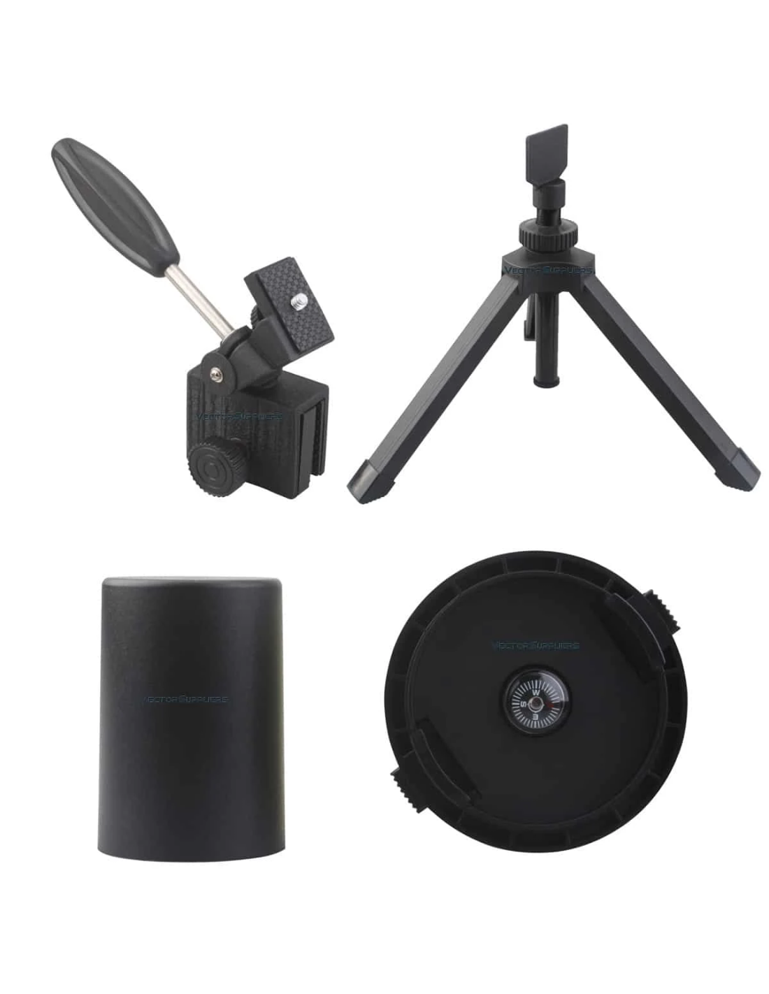 Accessoires fournis : trépied avec tête amovible, capuchon anti-poussière avec boussole, capuchon de lentille oculaire et chiffon de nettoyage.