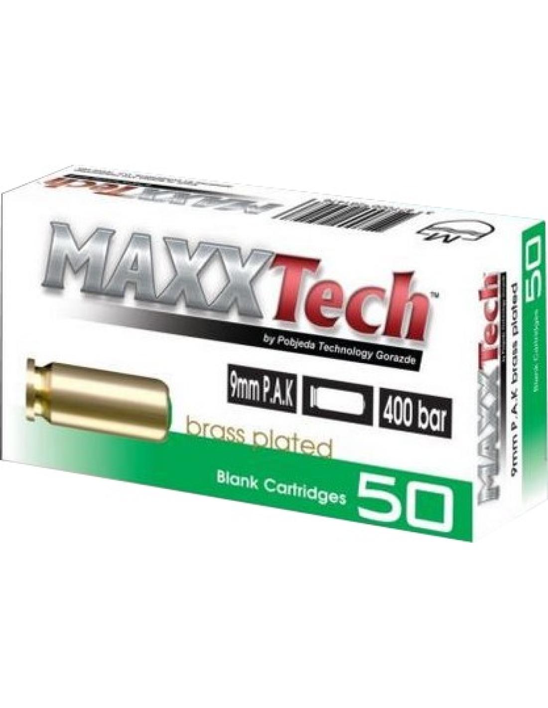MUNITIONS 9MM À BLANC X50 - 400BARS — Pack de 50 cartouches à blanc 9 mm PAK de la marque MAXXTECH, conçu pour le tir de signalisation et l’entraînement avec armes adaptées. Ces cartouches produisent un effet sonore et visuel sans projectile, à utiliser exclusivement dans des armes prévues pour munitions à blanc.