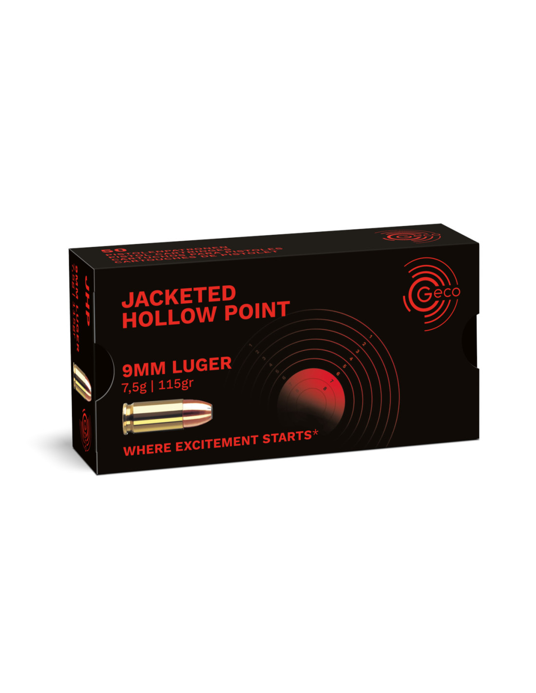 Cartouches GECO 9 mm Luger — 7,5 g / 115 gr JHP : munition moderne à ogive creuse (Jacketed Hollow Point) offrant un bon compromis entre précision, expansion contrôlée et alimentation fiable.