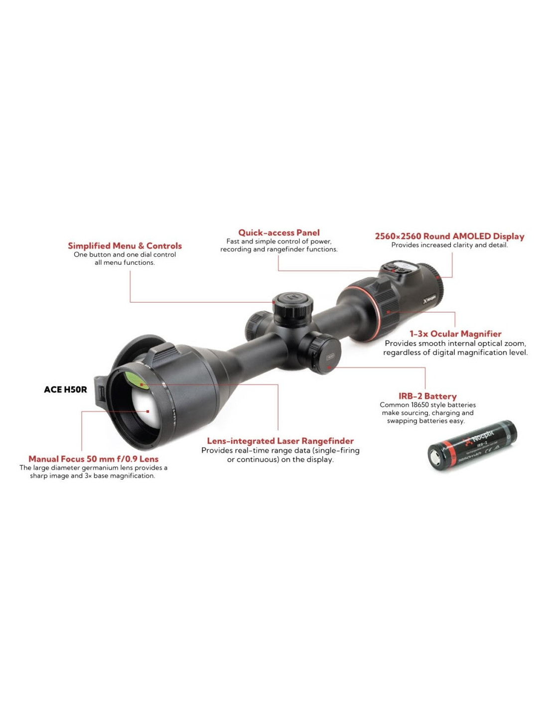 Puissante, précise et extrêmement complète, la ACE H50R LRF est une lunette thermique de référence pour les chasseurs exigeants, offrant une qualité d’image exceptionnelle et des fonctionnalités avancées pour des tirs maîtrisés à longue distance.