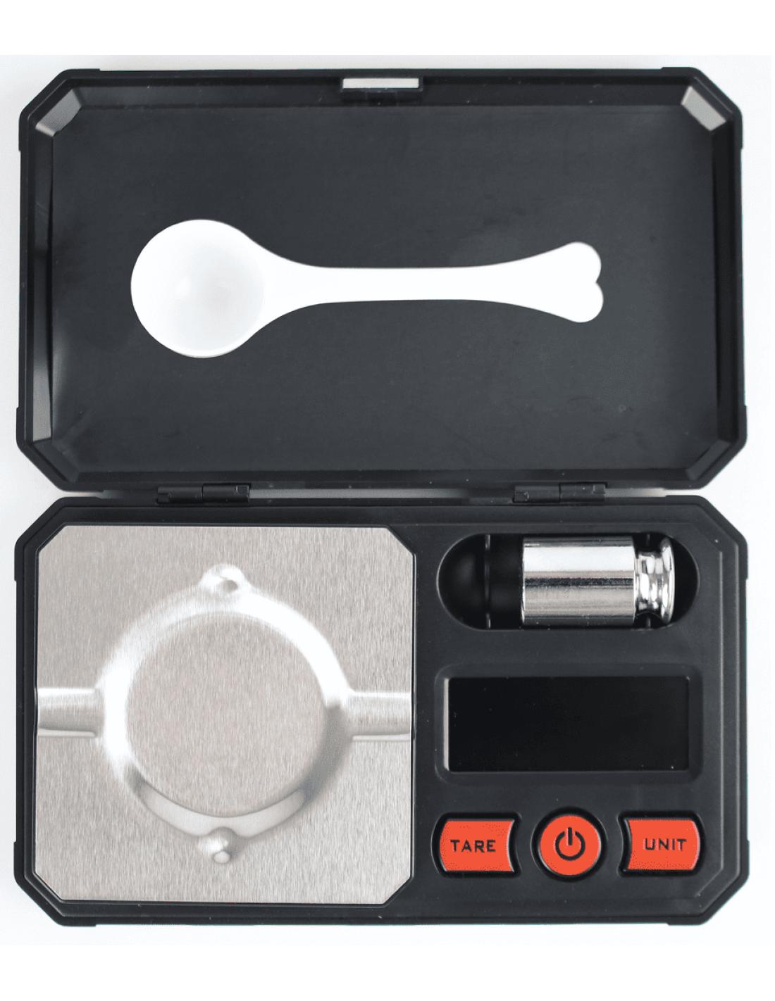 - Accessoires inclus : pelle à poudre, poids d’étalonnage, étui rigide